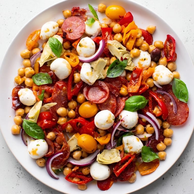 The beauty of this salad is that it's a template, not a commandment. If you don't like pepperoni, swap it for salami, prosciutto, or skip the meat entirely and add an extra handful of marinated mushrooms. If you're missing artichokes, a handful of roasted zucchini or sun-dried tomatoes will sing in their place. Some people add crispy chickpeas for extra crunch by baking some of them separately with olive oil and seasoning—it's a small touch that changes everything if you're in the mood for texture.
