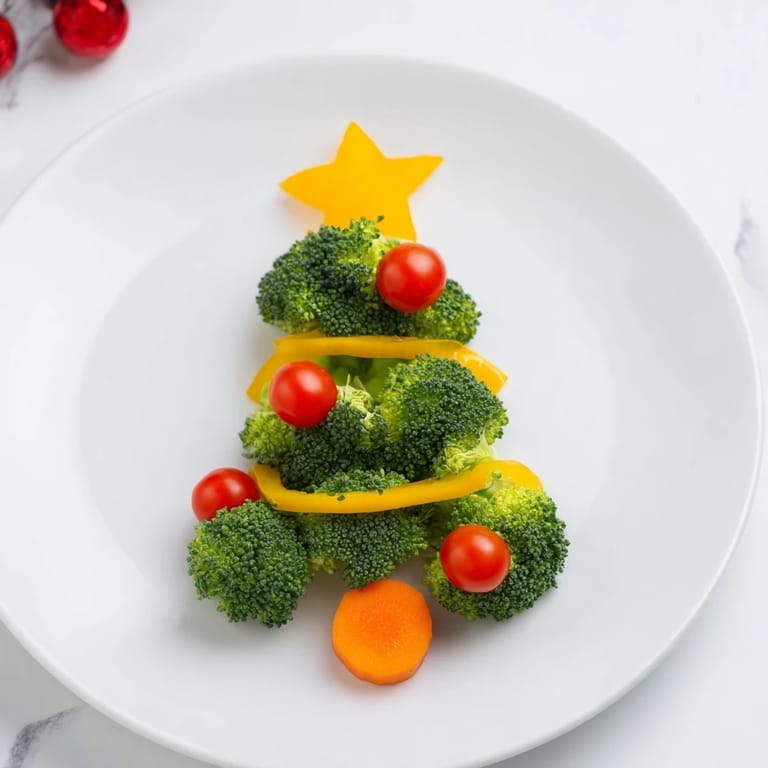 Pin It A whimsical and healthy party platter featuring broccoli florets arranged as a festive tree, adorned with vibrant cherry tomato ornaments. Perfect for holiday gatherings or a fun snack for kids.