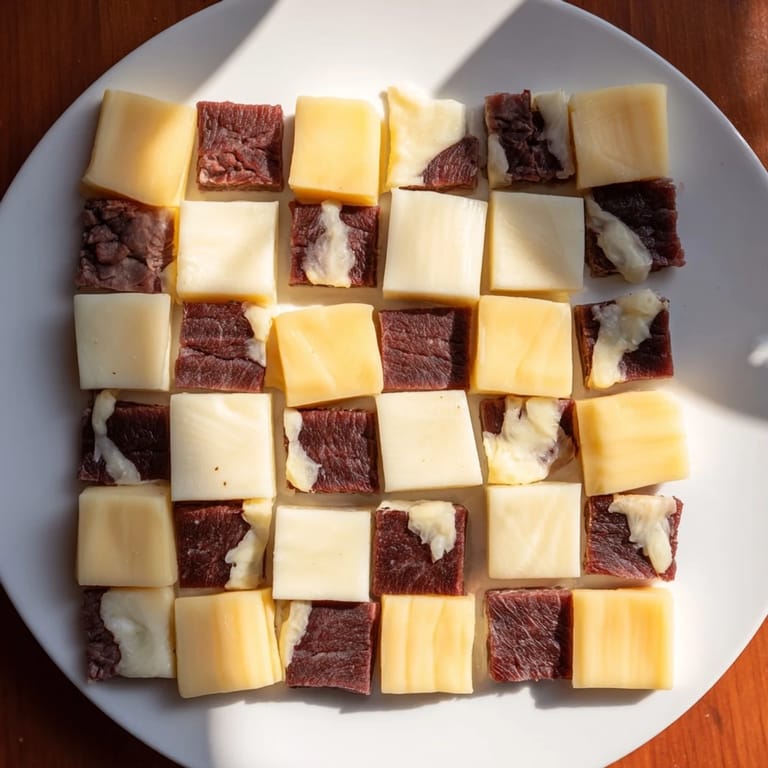 - Slice your meats and cheeses into 1-inch squares using a sharp knife. Listen for that clean cutting sound—it tells you your knife is doing the job right. Keep the squares roughly uniform; they don't have to be perfect, but consistency makes the checkerboard feel intentional rather than scattered. I like to lay them out on the cutting board in their ingredient groups first, organized like little armies waiting for deployment.