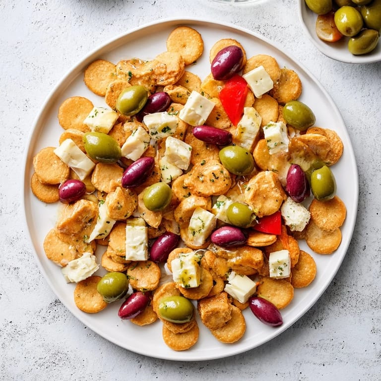 Pin It I discovered this platter concept at a small gathering in a friend's kitchen, watching her arrange crackers and olives on a board with the casual precision of someone creating edible art. There was something magical about how the round crackers caught the light like ancient stones, and the way people instinctively gravitated toward it—not just to eat, but to admire. It felt like bringing a piece of a Mediterranean courtyard into the room, and suddenly I understood why the simplest things often make the strongest impressions.