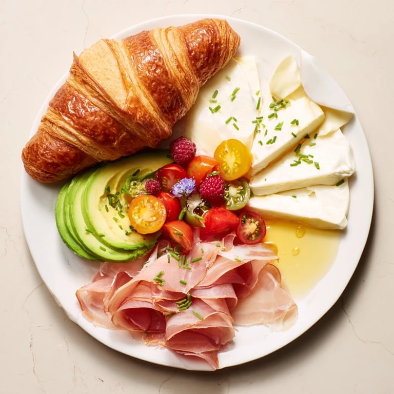 - Savory Accompaniments: 100 g brie cheese sliced, 100 g smoked ham (optional), 100 g gouda or cheddar cheese sliced, ½ cup cherry tomatoes halved, ½ avocado sliced