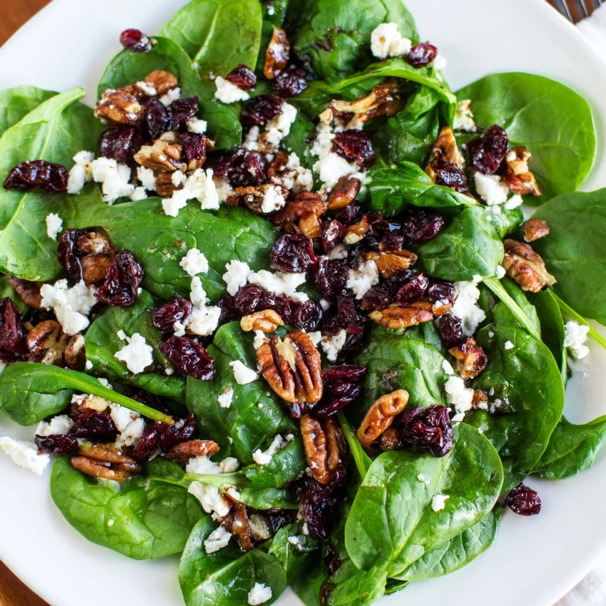 - Scatter the crumbled goat cheese, dried cranberries, and candied pecans evenly over the dressed spinach. Don't stir yet, just let them sit on top for a moment so you can see how pretty it looks.