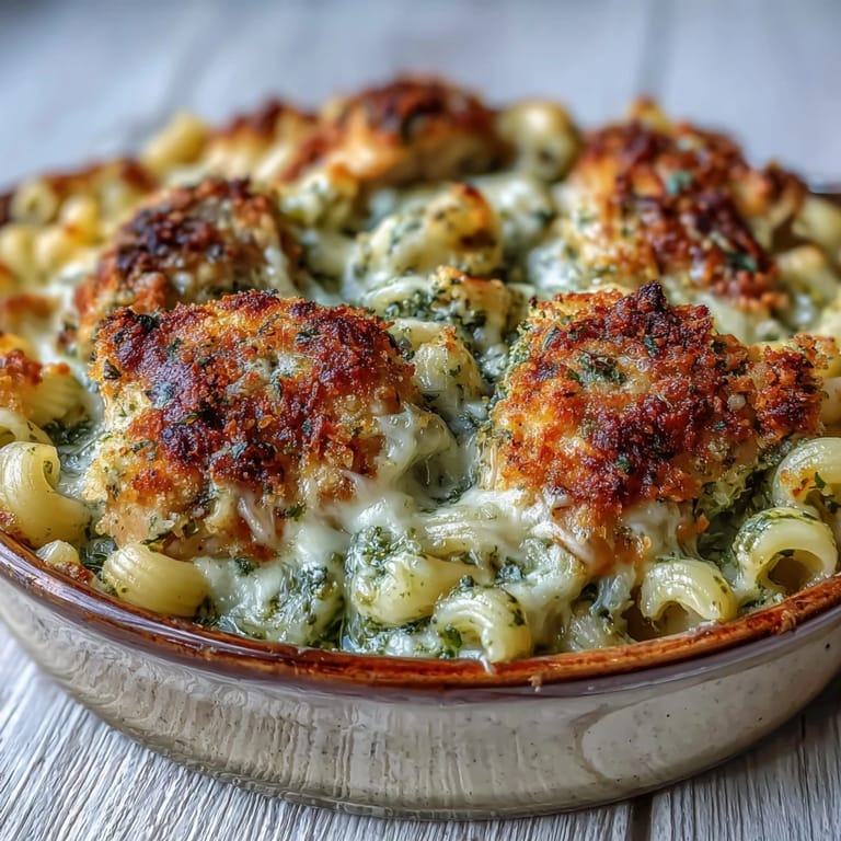Pin It There's something about the smell of basil hitting hot chicken that makes a kitchen feel alive. My neighbor knocked on the door one evening asking if I was making pesto, and that's when I realized I'd stumbled onto something special—a dish that somehow bridges the gap between weeknight comfort and the kind of meal you'd actually want to serve guests. Baked Pesto Chicken Mac and Cheese isn't fancy, but it doesn't need to be. It's the kind of casserole that disappears quietly from the dish, leaving everyone satisfied in that way that only creamy, cheesy pasta can deliver.